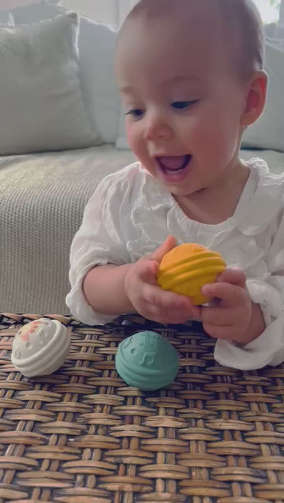 This set of Sophie la girafe 3 Musical Balls brings gentle auditory delight with every interaction. Lightly squeeze the green ball to hear the soft crumpled paper sound. Shake the white ball to hear a tinkling bell. Press the yellow ball briefly and you will hear Sophie la Girafe’s classic squeak. Each ball invites discovery and supports the development of cause and effect understanding.