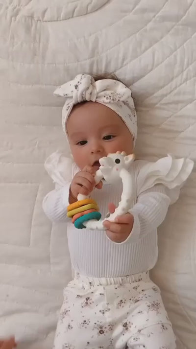 Get ready for Colo’Rings, the newest playful addition to the Sophie la girafe family. Designed with soft, textured surfaces—including rounded dots, ribbed sections, and Sophie’s ears and horns—this lightweight teether ring delivers gentle gum relief while engaging curious little fingers. Brightly coloured geometric shapes slide around the main ring for added tactile and visual stimulation during playtime.